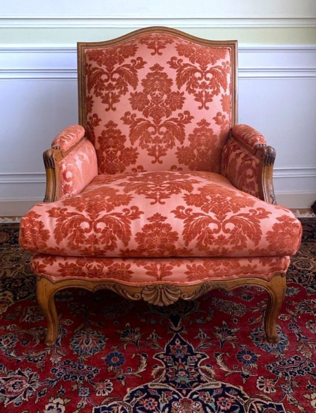 • OFICINA INGLESA : Poltrona com braços em madeira nobre , finamente estofada com tecido adamascado , modelo "Dove". Med. 80 x 80 x 96 cm alt