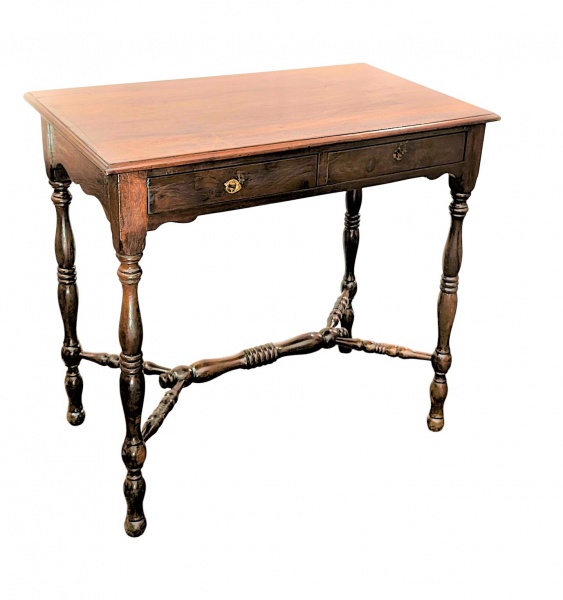 • Mesa auxiliar em madeira nobre , tampo retangular com duas gavetas e quatro pernas longelineas . Med. 74 x 44 x 70 cm alt