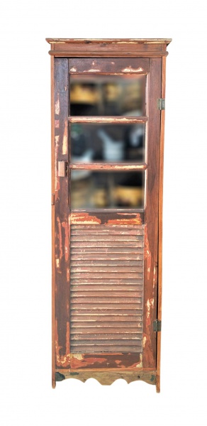 • Armário rústico em madeira e porta com veneziana e vidro, prateleiras internas, marcas do tempo . Med. 170 x 57 x 47 cm