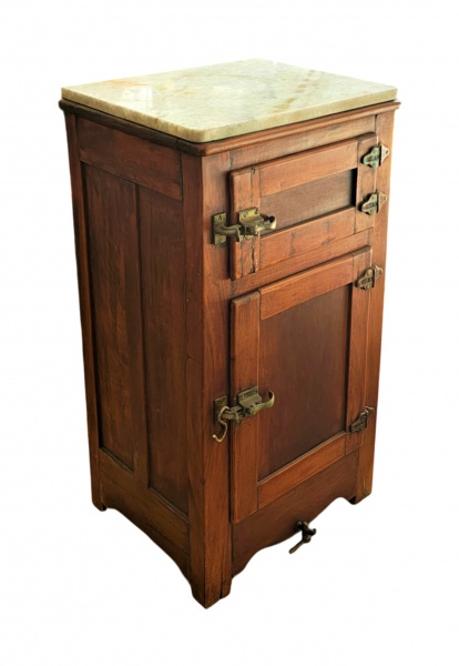 • Vintage - Antiga geladeira frigorífica dos anos 20/30, com funcionamento a partir do uso de barras de gelo, caixa de madeira nobre e tampo em mármore sendo um superior onde se colocava o gelo e o outro inferior onde se armazenava os alimentos. Med. 38 x 45 x 90 cm  (Marcas do tempo e de uso, no estado)