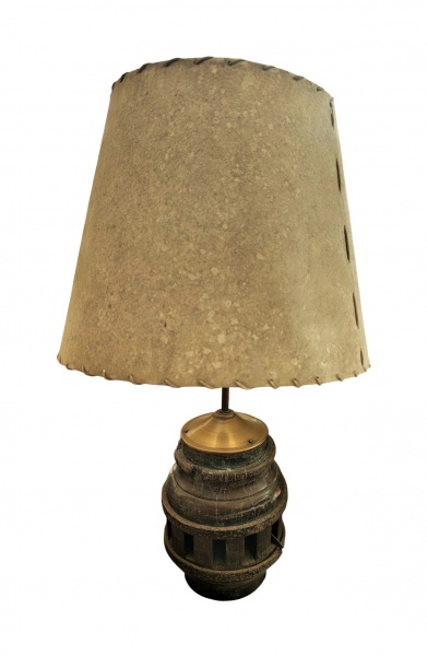 • Abajur montado sobre peça rustica em madeira , usada em fazenda , com cúpula em pergaminho. Med. 63 cm alt e 28 cm (cupula)