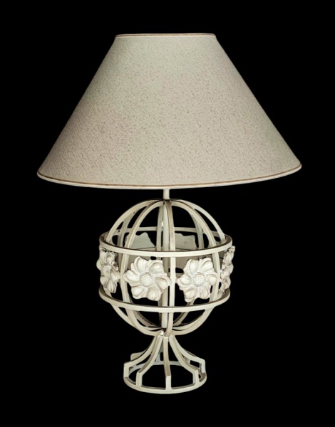 • Abajur montado sobre peça em ferro patinado de branco , apresenta cúpula. Med. 70 cm alt