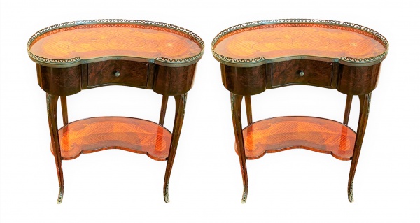 • Par de belas mesas laterais de apoio em forma de rim , tampo com fina marqueterie com gradil em bronze dourado e uma gaveta, quatro pernas amarradas por prateleira inferior e detalhes em bronze , muito bom estado de conservação. Med. 54 x 30 x 70 cm