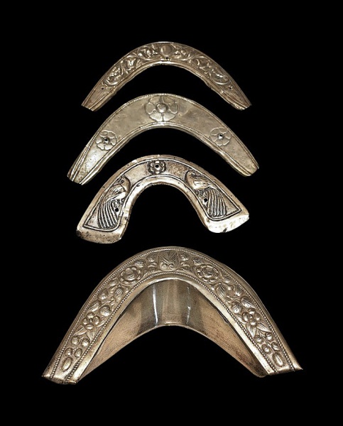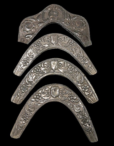 • Colecionismo: Lote de quatro adornos de cela e arreio em metal prateado e prata. Med. 28 x 6 cm