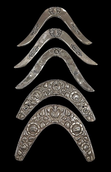 • Colecionismo: Lote de cinco adornos de cela e arreio em metal prateado e prata. Med. 28 x 6 cm