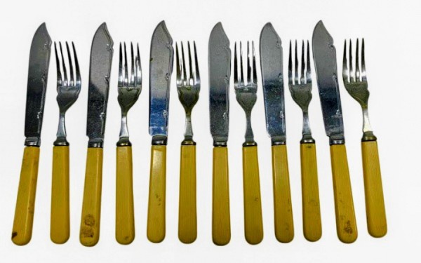 • Conjunto de talheres de peixe em metal espessurado a prata com cabos em marfinite. Med. 19 cm