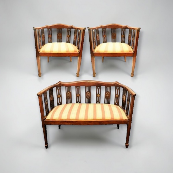 • Conjunto de namoradeira e duas poltronas em madeira nobre , estilo art deco , com assentos estofados em tecido , encosto com finos detalhes vasados, circa 1930. Med. 110 x 40 x 80 cm (namoradeira) e 58 x 40 x 80 cm (cadeiras)