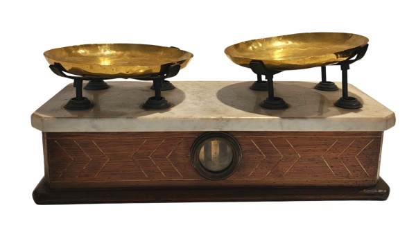 • Colecionismo : Rara balança de farmácia em madeira nobre , mármore e pratos em latão polido com marcações de aferições de época , circa 1880. Med. 51 x 20 x 25 cm