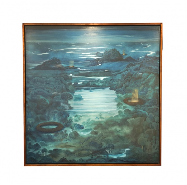 • Walderedo Jr.: "Paisagem" , óleo s. tela sem assinatura aparente. Med. 140 x 140 cm (Nota Biográfica: Walderedo de Oliveira Júnior. (Rio de Janeiro RJ 1955). Pintor, desenhista e gravador. Estuda com Ivan Serpa (1923-1973) em 1970 no Centro de Pesquisa de Arte, no Rio de Janeiro. Em 1975 muda-se para Paris (França), onde permanence por seis anos. Lá diploma-se em pintura e desenho pela École Nationale Supérieure des Beaux-Arts Escola Nacional Superior de Belas Artes. Expõe seus trabalhos em individuais em várias cidades como Paris, Amsterdã (Holanda) e Marrakesh (Marrocos), entre outras. Depois de viver por seis meses em Marrocos volta ao Brasil, em 1982, permanecendo por 15 anos no Rio de Janeiro. Participa de exposições no Rio de Janeiro, em São Paulo, na Alemanha e nos Estados Unidos, para onde viaja em 1983. Em 1997 muda-se para Tóquio (Japão), onde reside por três anos. Em 1997 ministra palestras sobre arte criativa e meio ambiente, na Faculdade de Tóquio. Nesse mesmo ano participa do World Art Festival 1997, em Kyoto (Japão). Em 1998 participa do US-Japan Earth Commit em Tóquio. No ano 2000 volta a viver no Brasil.)
