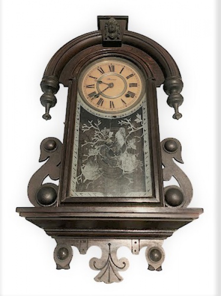 • Relógio de parede , marca Ansonia ,com pendulo, não testado.(Falta a chave) Med. 60 x 32 cm