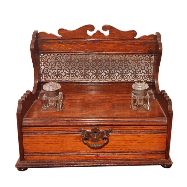 • Excepcional tinteiro inglês em carvalho , com dois recipientes para tinta em cristal , uma gaveta inferior com puxador em bronze e fundo em madeira fenestrada . Inglaterra séc XIX. Med. 35 x 20 x 25 cm alt