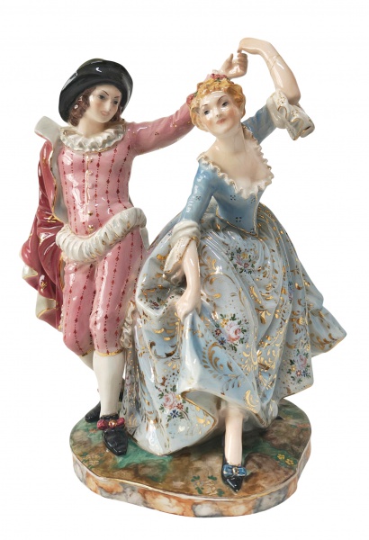 • NAPOLI : Grupo escultórico em porcelana italiana "Napoli", representando casal bailando. Med. 31 cm alt (apresenta defeito em um braço)