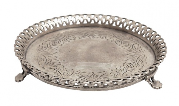 • Salva em prata de lei, com grade vasada e fundo cinzelado , contrastada. Peso 157 gr . Med. 14 cm diam