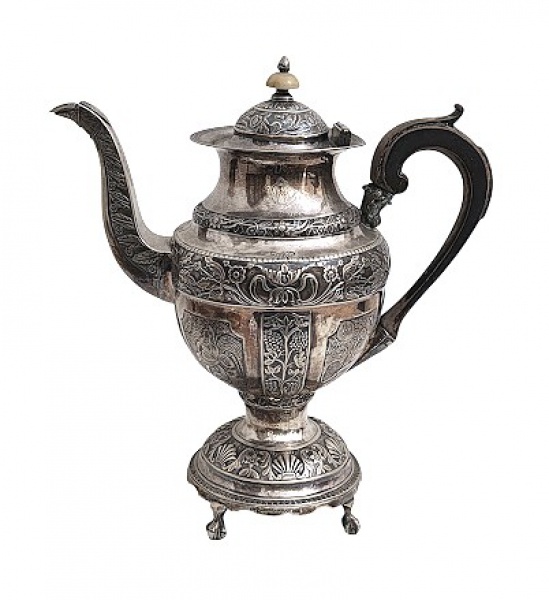 • Excepcional chocolateira em prata de lei , finamente cinzelada , contrastada, séc XIX. Peso. 1082 gr . Med. 27 cm alt