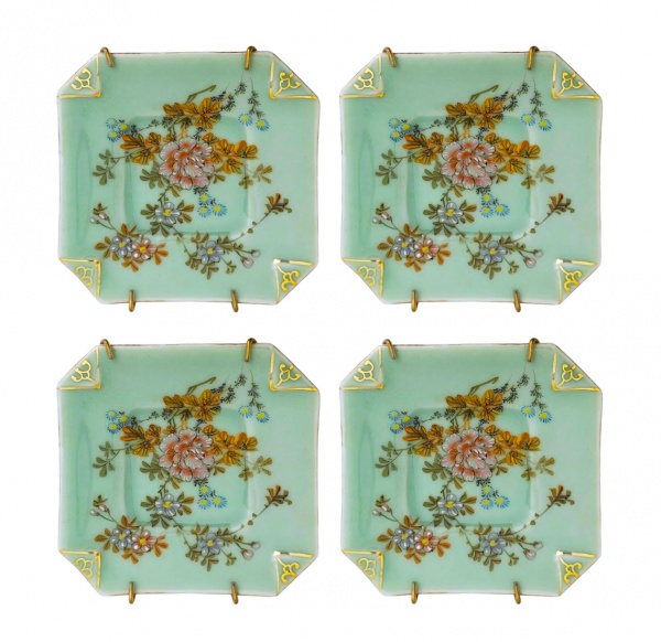 • Conjunto de quatro pequenos pratos chineses celadon com fina pintura floral , marcas no fundo. Med. 13 x 13 cm