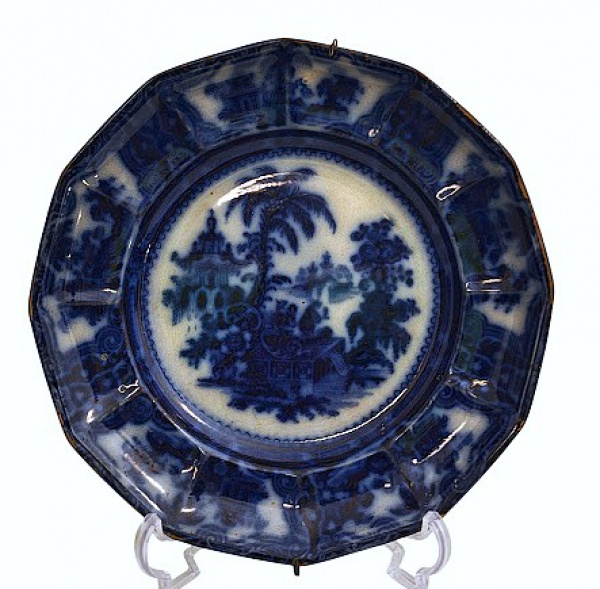 • Antigo prato ingles borrão, bordas sextavadas, marca "", Irestone. Med. 23 cm diam
