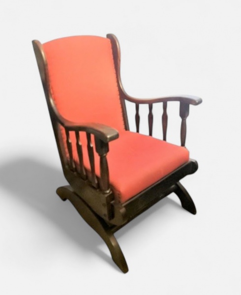 • Antiga cadeira de balanço em madeira nobre estofada em tecido. Med. 60 x 60 x 88 cm