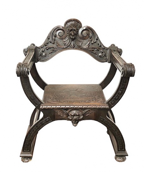 • Espetacular cadeira savanarola , construida em madeira nobre .Testeira ricamente entalhada com animais mitológicos , folhas e volutas , braços retilíneos terminados com punhos de enrolamentos , assento quadrangular tambem em madeira com finos entalhes , bordas em grodões , pernas arqueadas , barra frontal guarnecida por mascarão , assente sobre quatro pés em