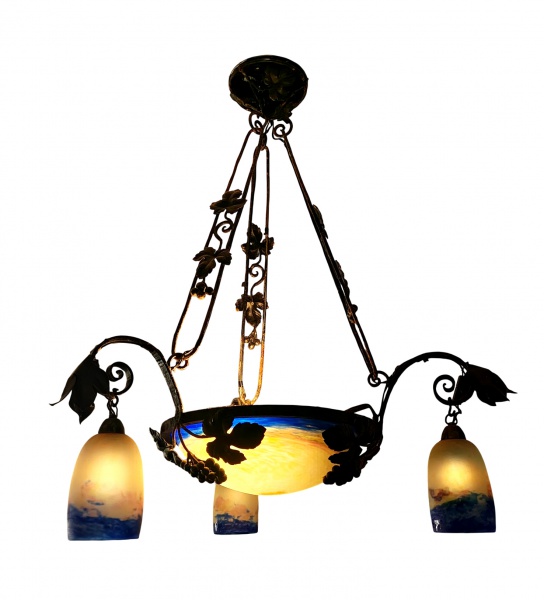 • DEGUÉS FRANCE : Excepcional lustre com estrutura em fér forget e pasta de vidro . Lustre composto de plafon central e três braços com cúpulas em pasta de vidro, assinado nas cúpulas . França 1920 . Med. 90 cm alt x 65 cm diam