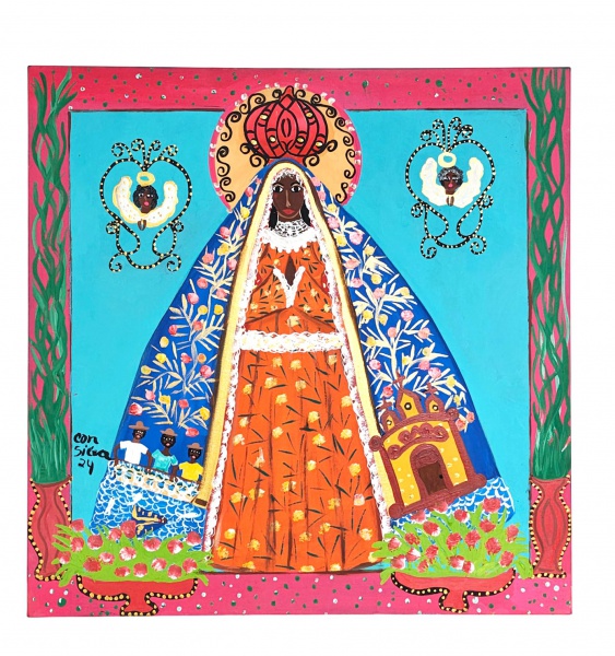 • CONCEIÇÃO Silva : Nossa Sra. Aparecida. Óleo s/ tela, ass. dat. 2024 lat. esq. e no verso. Med. 60 x 60 cm