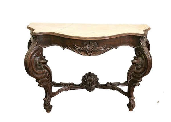 • Excepcional e antigo console construido em jacarandá , tampo em mármore de carrara , elaborado em estilo neorrocó , caixa movimentada com ricos entalhes , pernas projetadas recurvas e pés amarrados por travessão e concha ao centro , Brasil séc XIX. (mármore apresenta defeito na lateral). Med. 128 x 40 x 95 cm alt