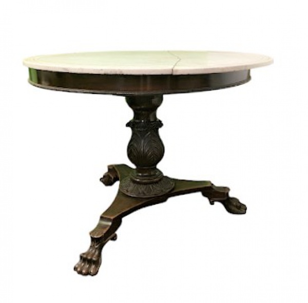 • Magnífica mesa doceira em jacarandá , com tampo em mármore de carrara , bordas esculpidas com sulcos , coluna central torneada , sobre base trípode e pés em pata de bicho, Brasil , séc XIX. (mármore no estado). Med. 100 cm diam x 77 cm alt